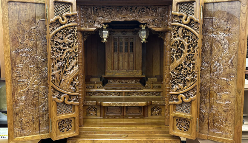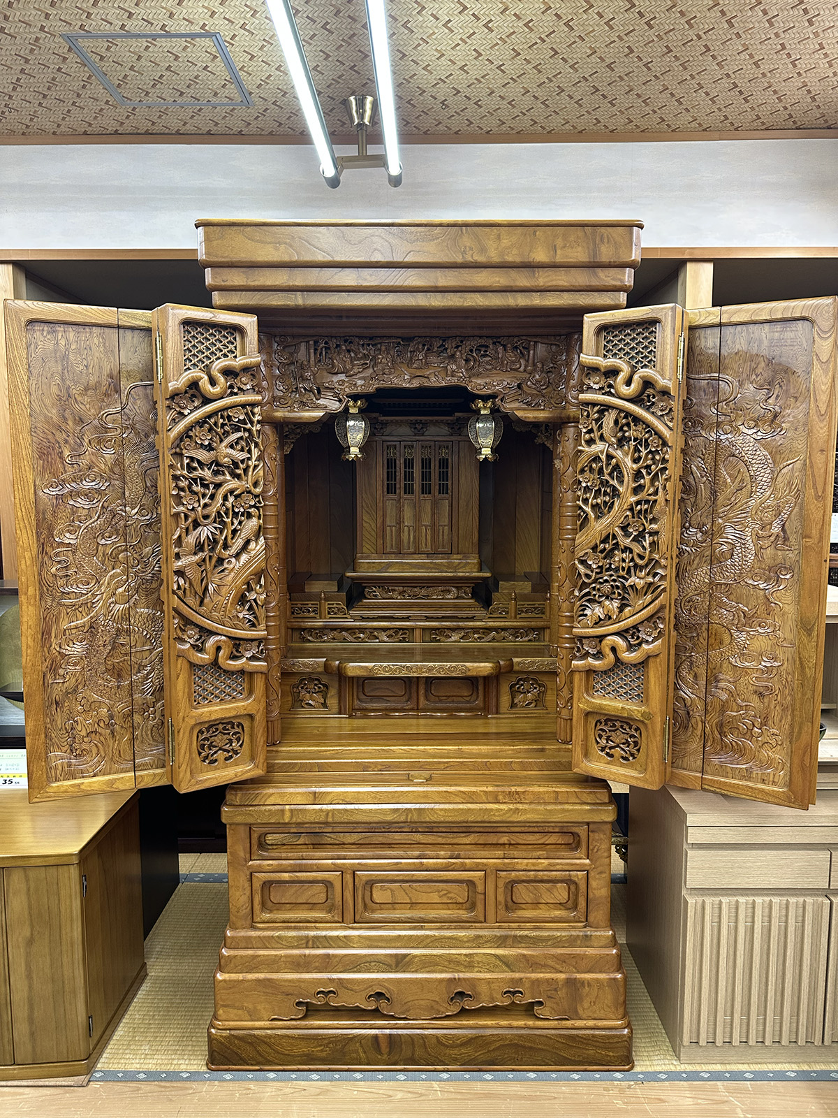純国産です。戸板の裏に屋久杉登り龍・下り龍の彫りが見事です。