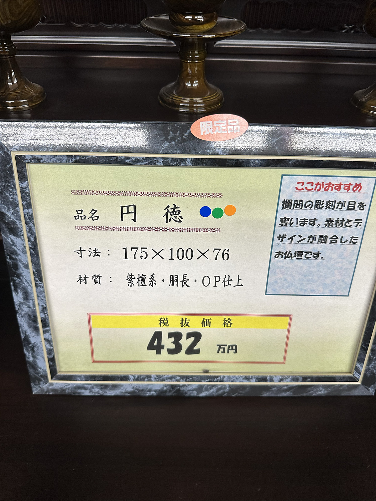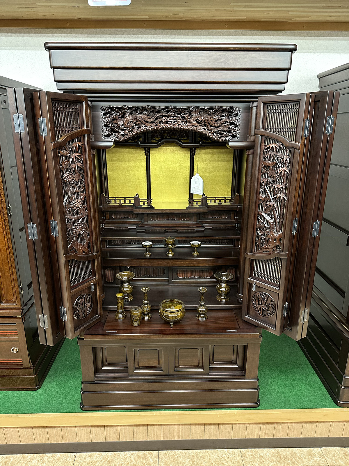 欄間の彫刻が目を奪います。素材とデザインが融合したお仏壇です。