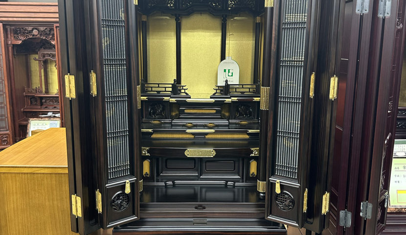 コンパクトですが存在感のあるデザインで、金金具が豪華さを感じさせるお仏壇です。