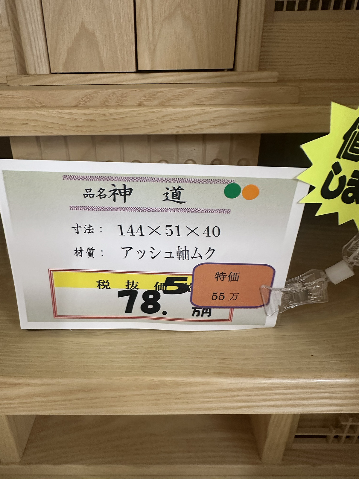 202603 セール 仏壇 21 2026.02.28 セール商品 2026年 3月 売り尽くしセール商品 寸法: 144 × 51 × 40cm 材質: アッシュ軸ムク 通常価格 785,000円(税抜) 税込 863,500円 特別価格 270,000円(税抜) 税込 297,000円 202603 セール 仏壇 22 前の記事 202603 セール 仏壇 20 次の記事